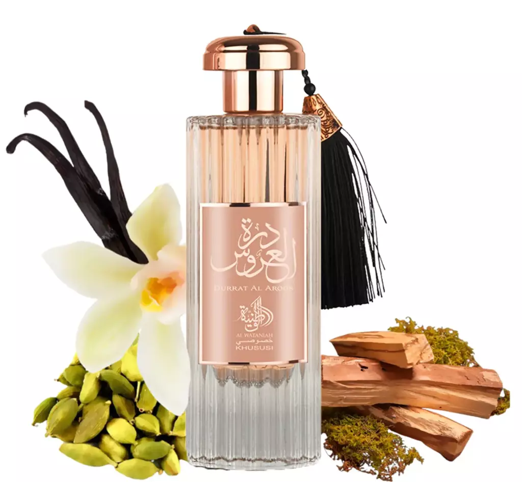 O perfume é uma mistura de notas doces e florais, incluindo jasmim, rosa, bergamota e almíscar. Ele foi projetado para evocar uma sensação de luxo e sofisticação, tornando-o uma escolha popular para eventos formais e ocasiões especiais. A fragrância é frequentemente vendida em uma variedade de formas, incluindo óleo de perfume, Eau de Parfum e névoa corporal, para atender a diferentes preferências e ocasiões. No geral, o perfume "Durrat Al Aroos" é uma fragrância altamente considerada e popular entre as comunidades árabes e aqueles que apreciam os aromas árabes.